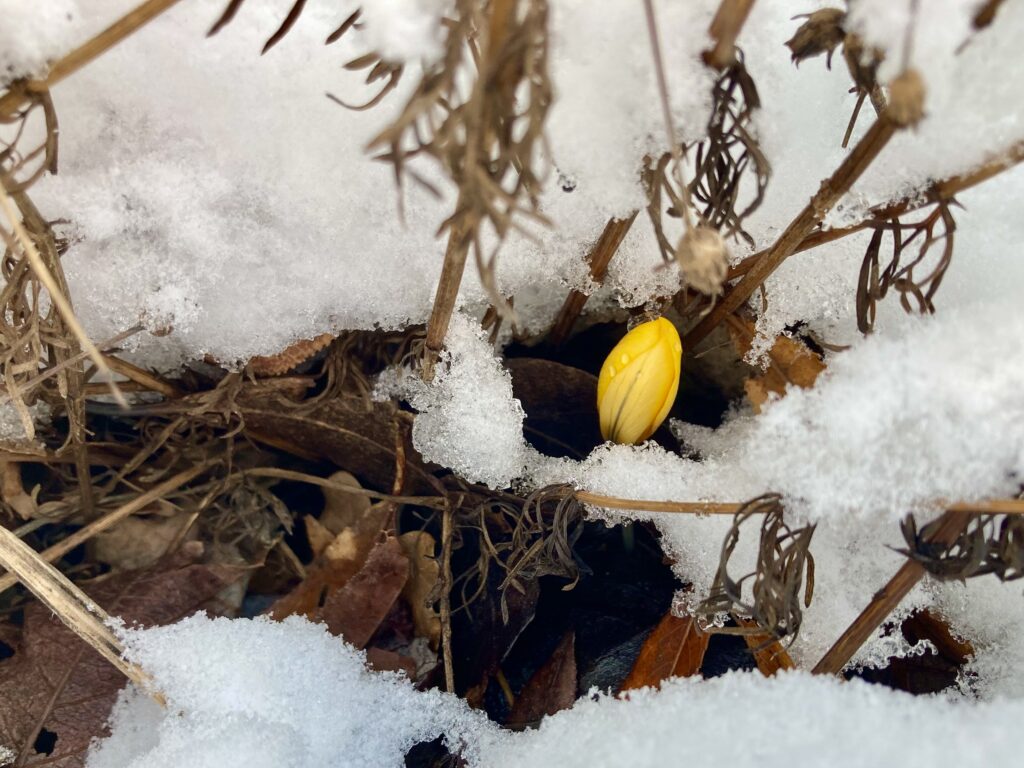 En gul krokus i snön väcker vår uppmärksamhet. En tanke tar form. Här börjar hållbar utveckling.